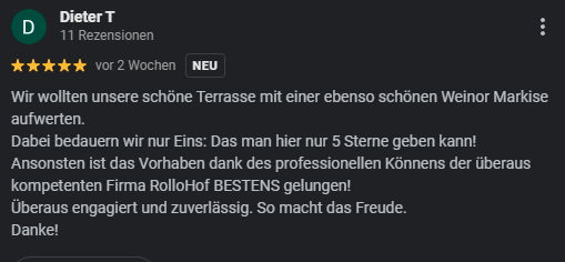 Gemeinsam mit unserem Top-Hersteller weinor garantieren wir höchste Qualität, modernes Design und langlebige Produkte. Vertrauen Sie auf unsere Erfahrung und unseren Rundum-Service – direkt aus Hof.